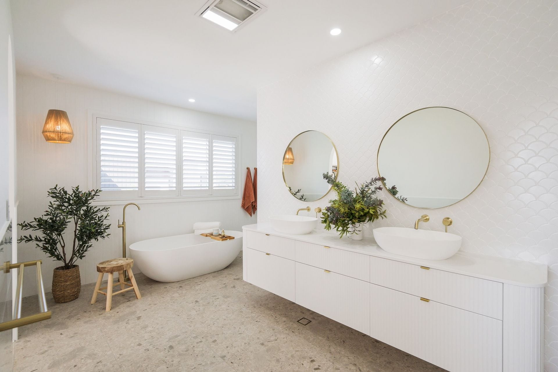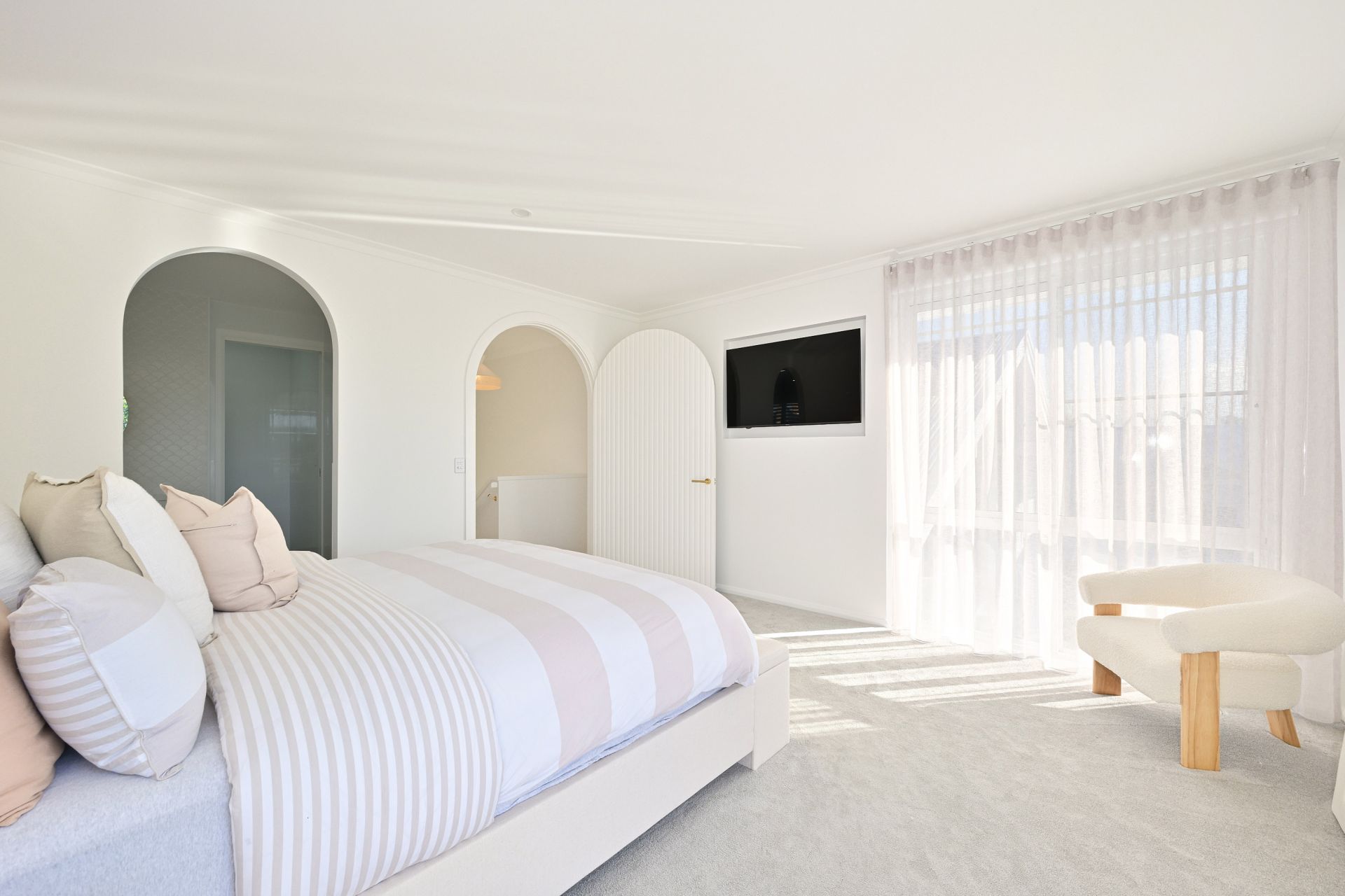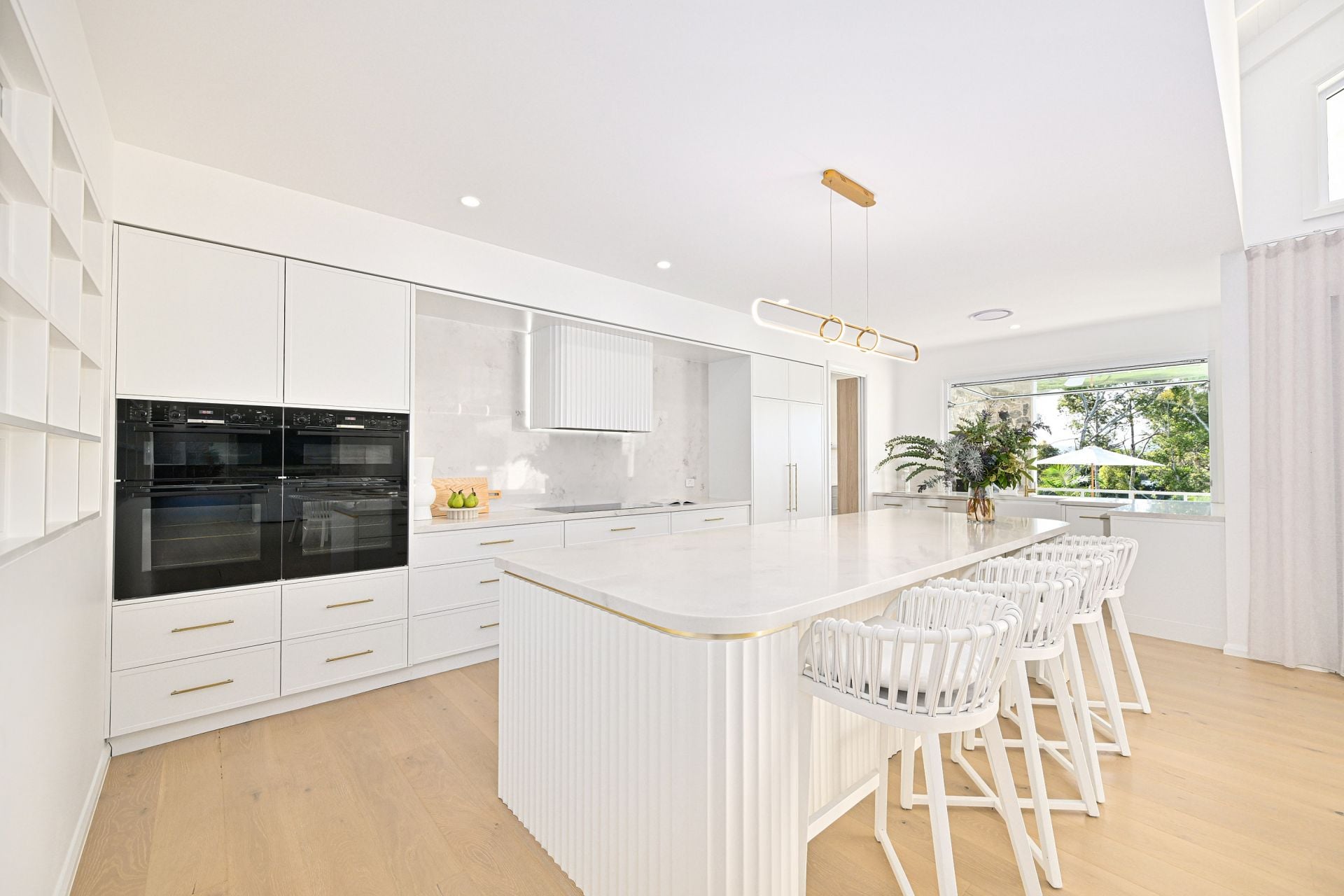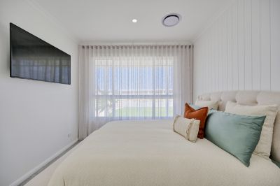 The main part of the home provides for four extremely comfortable bedroom suites, all with their own luxe full bathrooms, again finished with custom curved cabinetry and brushed gold tapware. The master bedroom suite is a particular highlight. Set-away at the far wing of the home, as you pass through the custom-made oversized curved door, you enter the ultimate parents' retreat. Capture the river views and cool breezes year-round from your private balcony or relax in the bedroom of the grandest proportions. The exquisite ensuite features double vanity, a freestanding bath and a walk-in shower which circles around into the irresistible walk-in-robe/ dressing room.