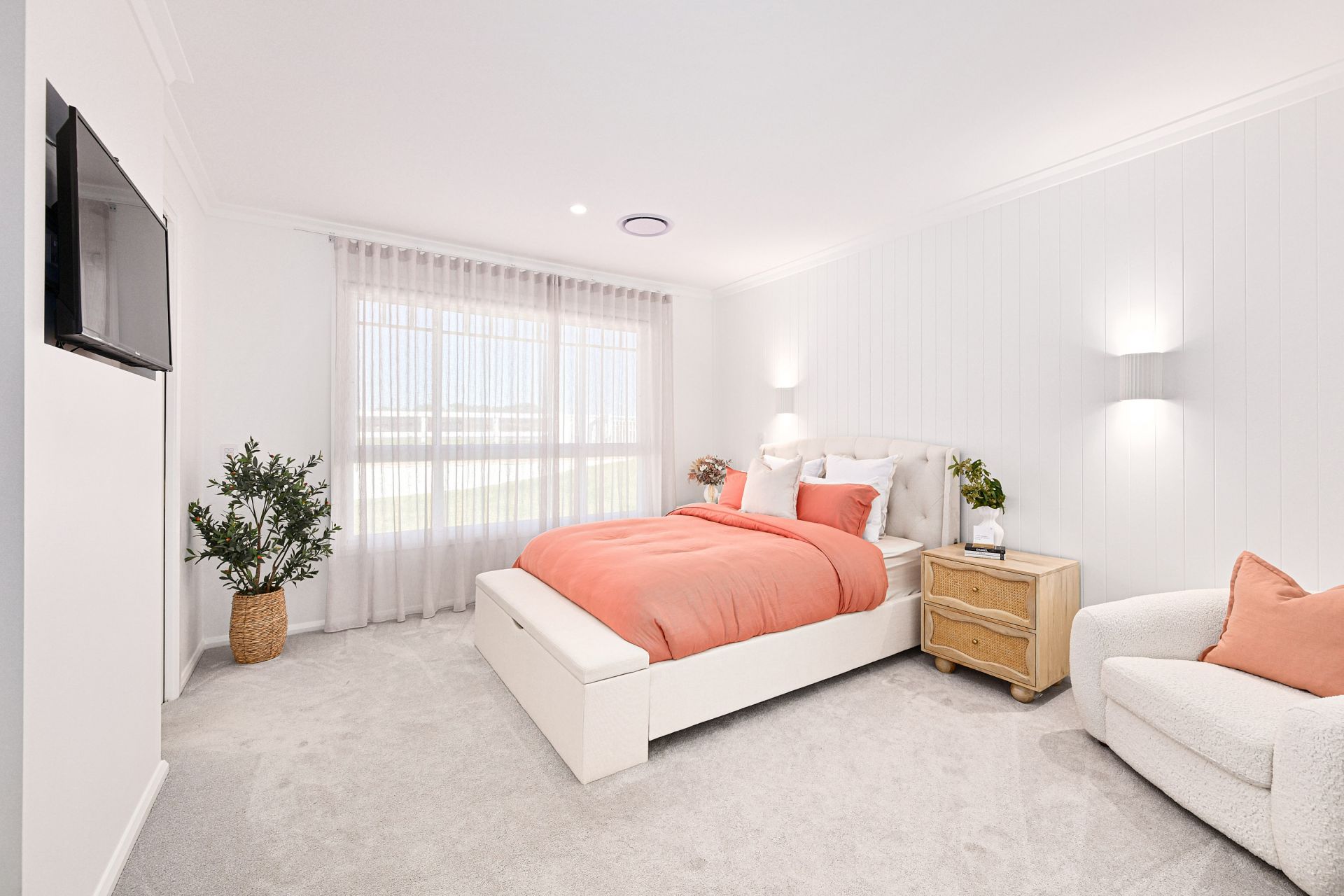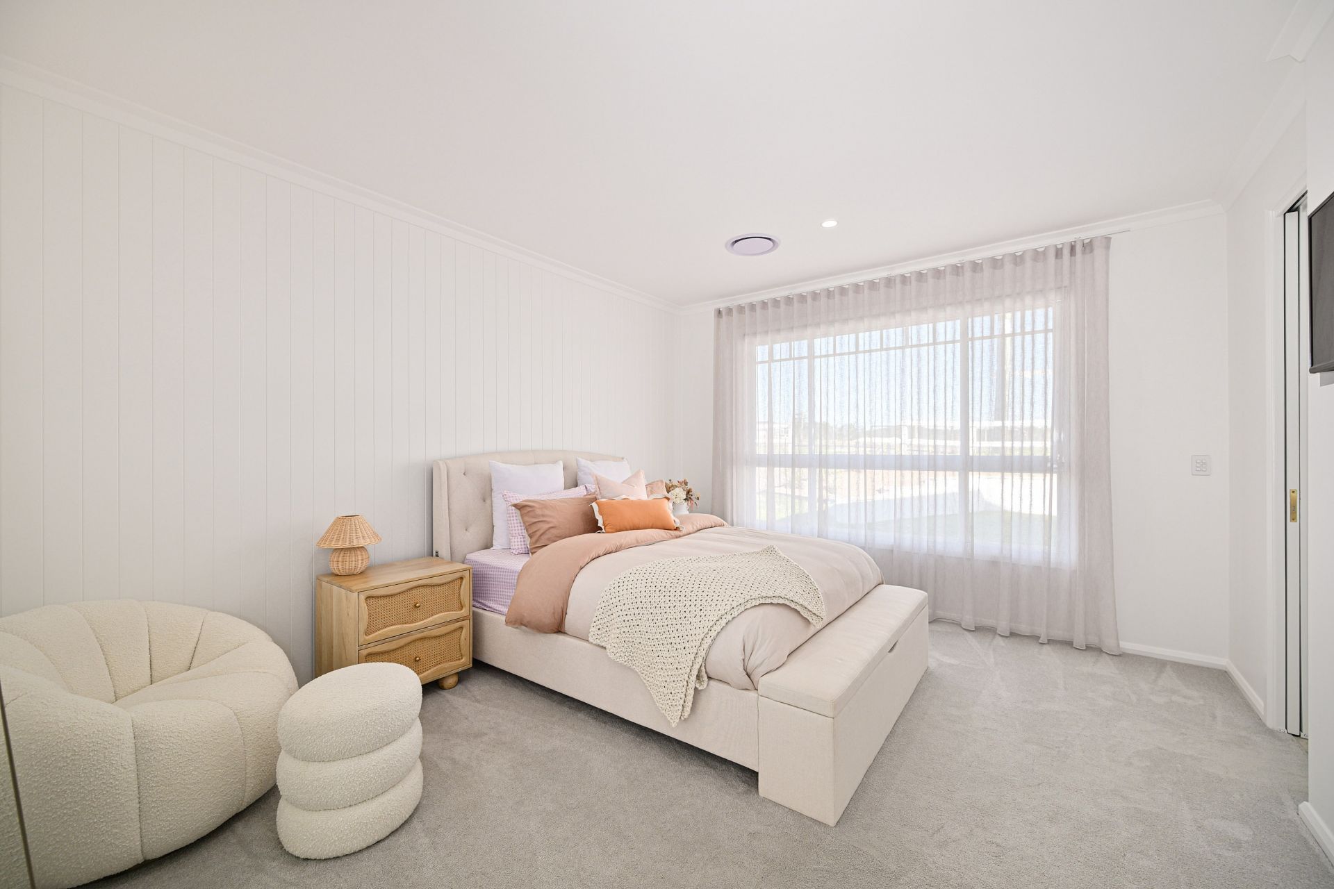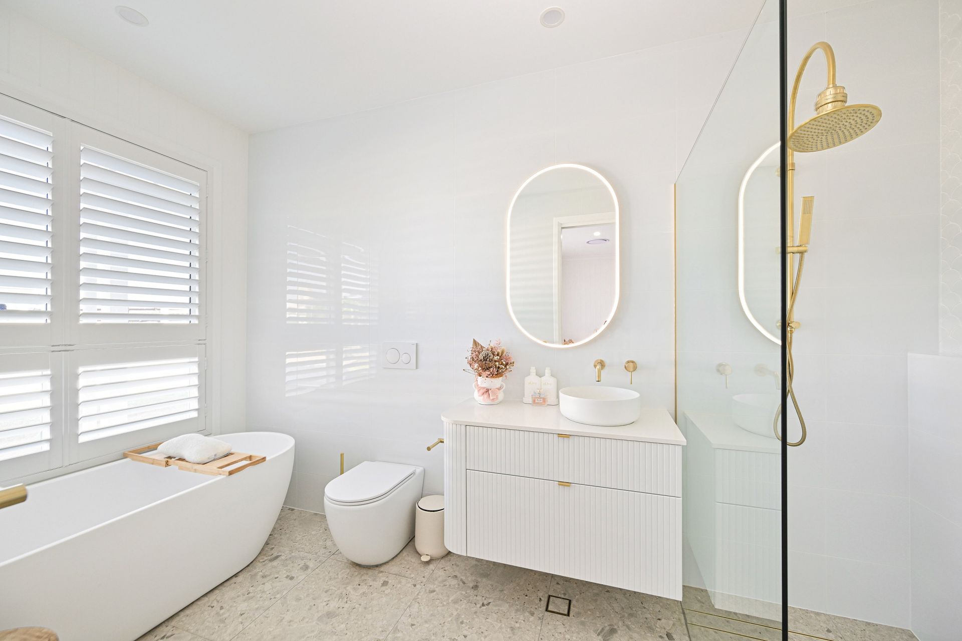 The main part of the home provides for four extremely comfortable bedroom suites, all with their own luxe full bathrooms, again finished with custom curved cabinetry and brushed gold tapware. The master bedroom suite is a particular highlight. Set-away at the far wing of the home, as you pass through the custom-made oversized curved door, you enter the ultimate parents' retreat. Capture the river views and cool breezes year-round from your private balcony or relax in the bedroom of the grandest proportions. The exquisite ensuite features double vanity, a freestanding bath and a walk-in shower which circles around into the irresistible walk-in-robe/ dressing room.
