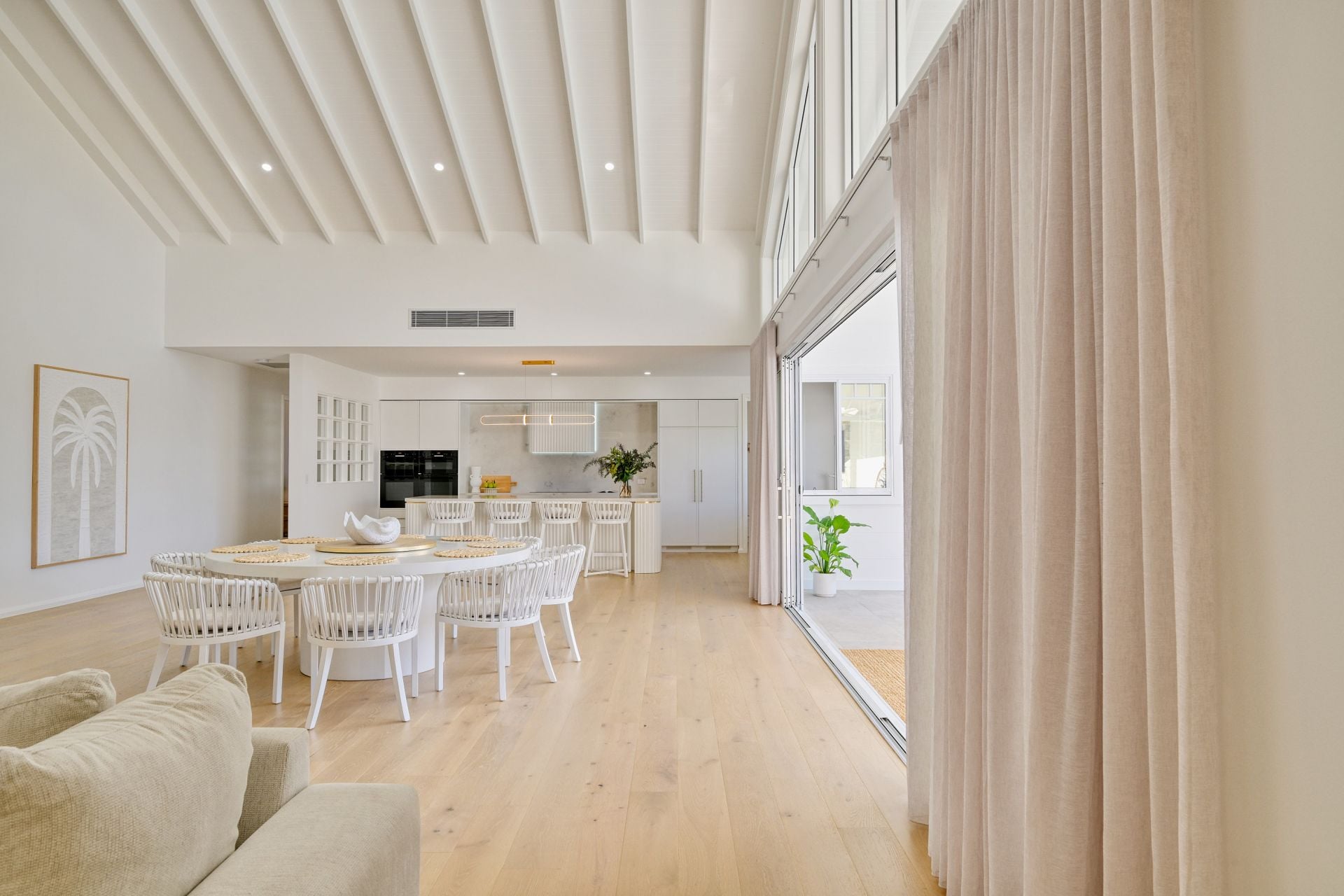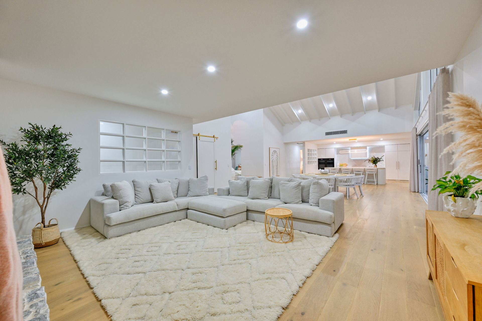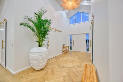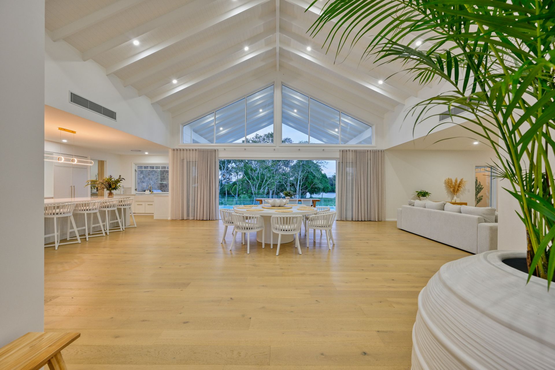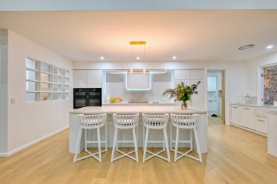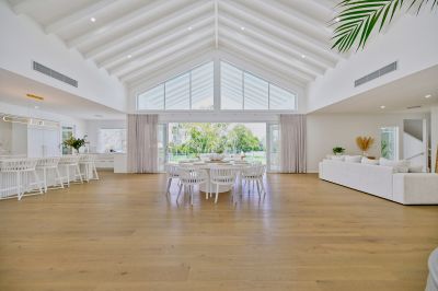As you enter your private gated driveway and into the home via the immense 2.4m pivot front door, you are impressed by the spectacular 6.5m ceilings, gorgeous, herringbone engineered timber floors and impressive view of the river which sets the tone for what lies ahead. The centrally positioned, open plan living area is of epic proportions, with awe-inspiring raked ceiling and a wall of custom-made glazing which captures the picturesque river views and entices the sunlight in. Here, a showstopping designer kitchen, is the heart of everyday entertaining and features integrated appliances, broad 40mm stone benchtops, the ultimate fully-fitted butlers' pantry, electric gastrut servery window and gorgeous finishing touches such as brushed brass hardware and sleek curved cabinetry. This area has been designed with grand dinner parties in mind. The substantial dining zone provides ample space and the wonderful lounge area, with solid stone fireplace will have you entertaining throughout the year.