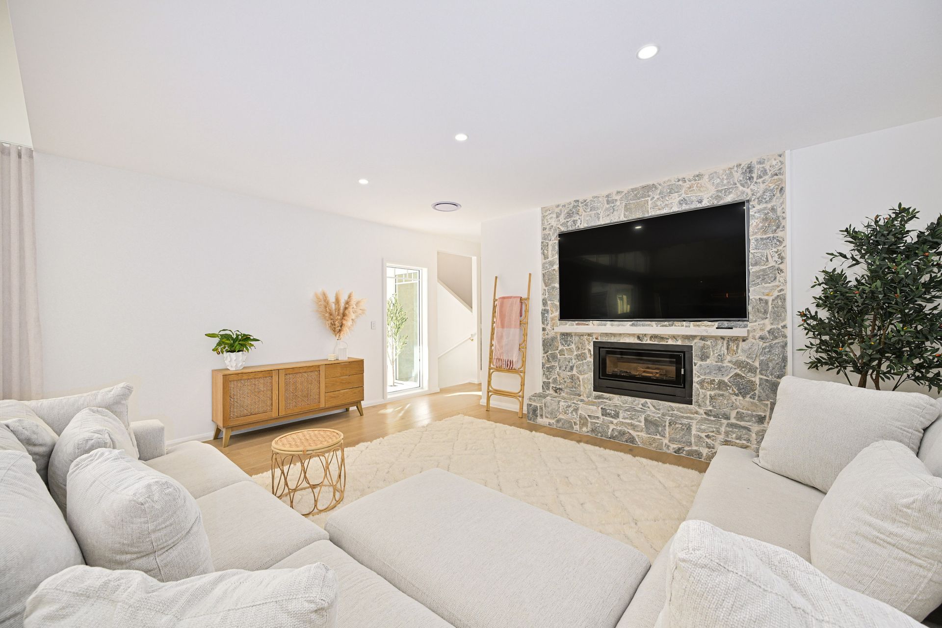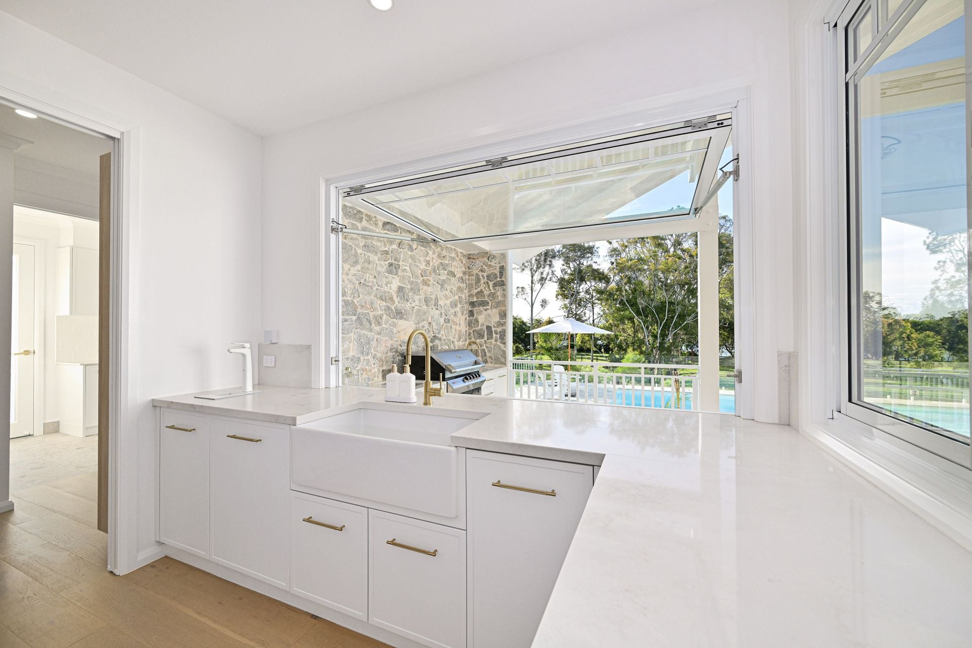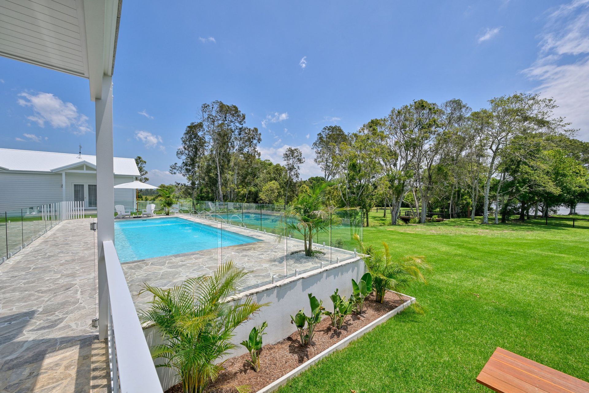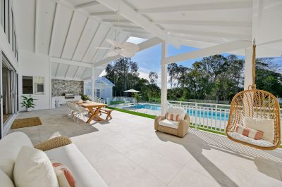 A real feature of the home has to be the incredible outdoor lifestyle that flows out from the home and offers a seamless extension of the living. Mirroring the interior, this huge space features opulent finishes, a fully equipped outdoor kitchen, breakfast bar, alfresco dining and a lounge area set around a second solid stone fireplace with built-in TV. Rivaling the best 6-star resort, this space leads down wide stairs to the sleek white 12m swimming pool, surrounded by beautiful stone crazy paving and a chic curved pool fence. Gorgeous established gardens beyond, total privacy and backing onto the majestic river, where you enjoy water sports and activities or just soak in the mesmerising views, complete this outdoor escape.