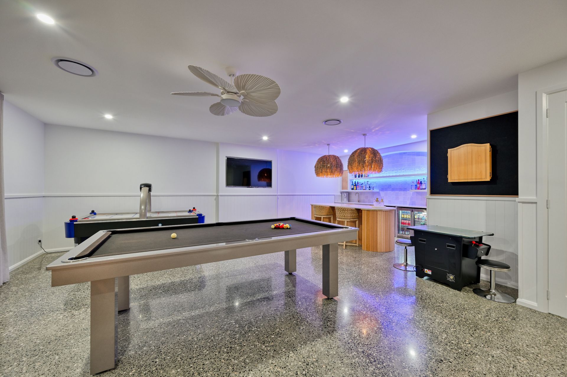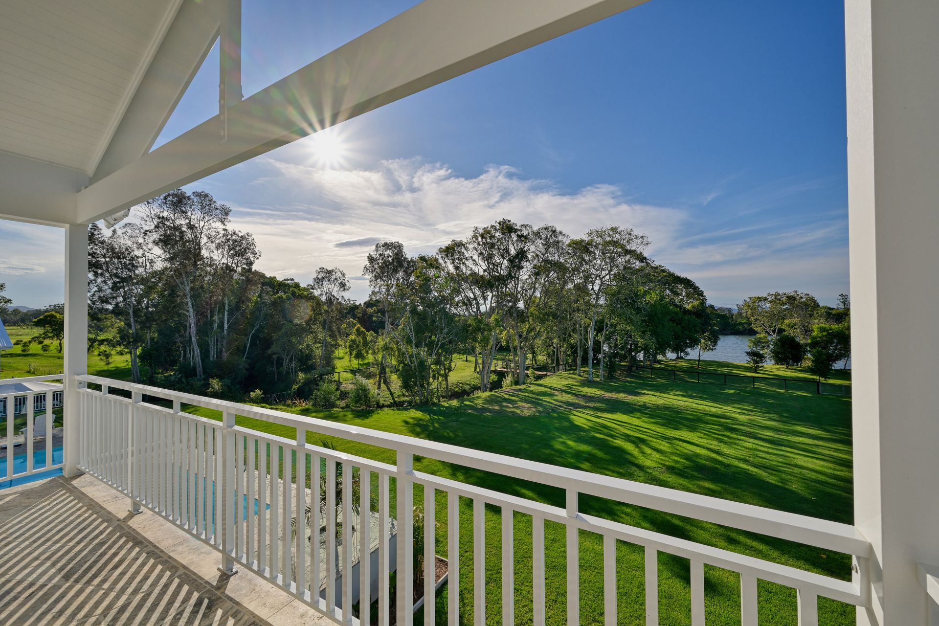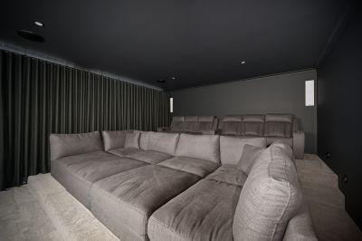 Back inside, the design of this home caters for everyone in the family. The state-of-the-art movie theatre offers two-tier seating with enough space for 15+ people. Finished with high-tech surround sound, led mood lighting and the biggest residential projector screen you've seen. The ultimate in entertaining guests is catered for in the customised cocktail bar and games room, which is finished with polished concrete floors and set away by itself, so you can party in peace! You'll love hosting people by the fully equipped bar, wine cellar, pool table, games area. Again, overlooking the river, it has its own private balcony, which also leads to the pool. There is also a fully equipped office, with customised joinery, so you can work from home in style.