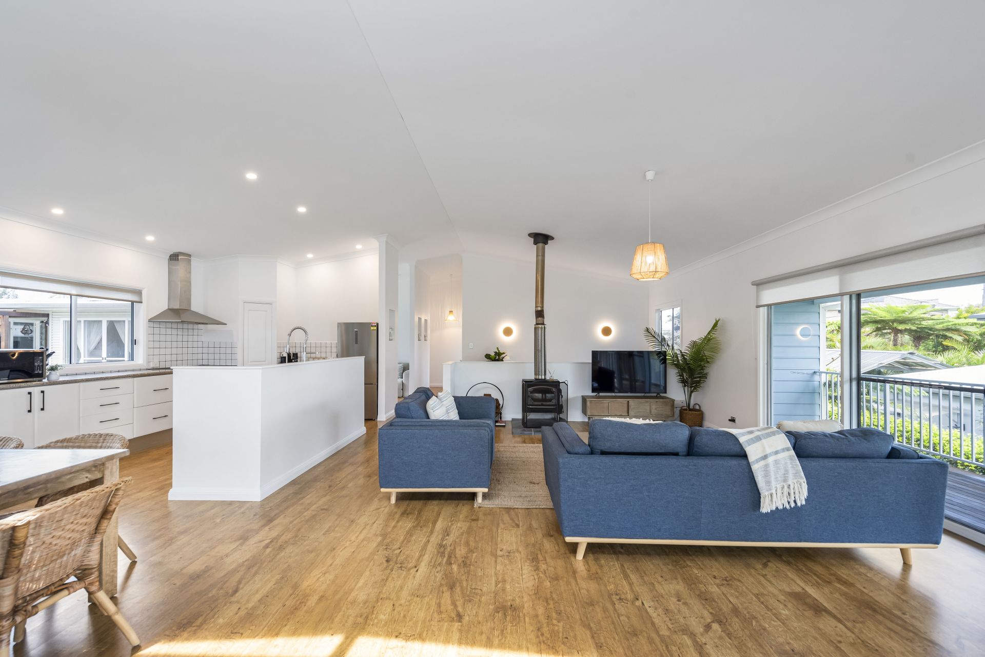 - Light filled, open plan lounge and dining with wood fire