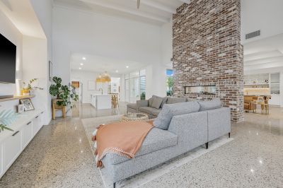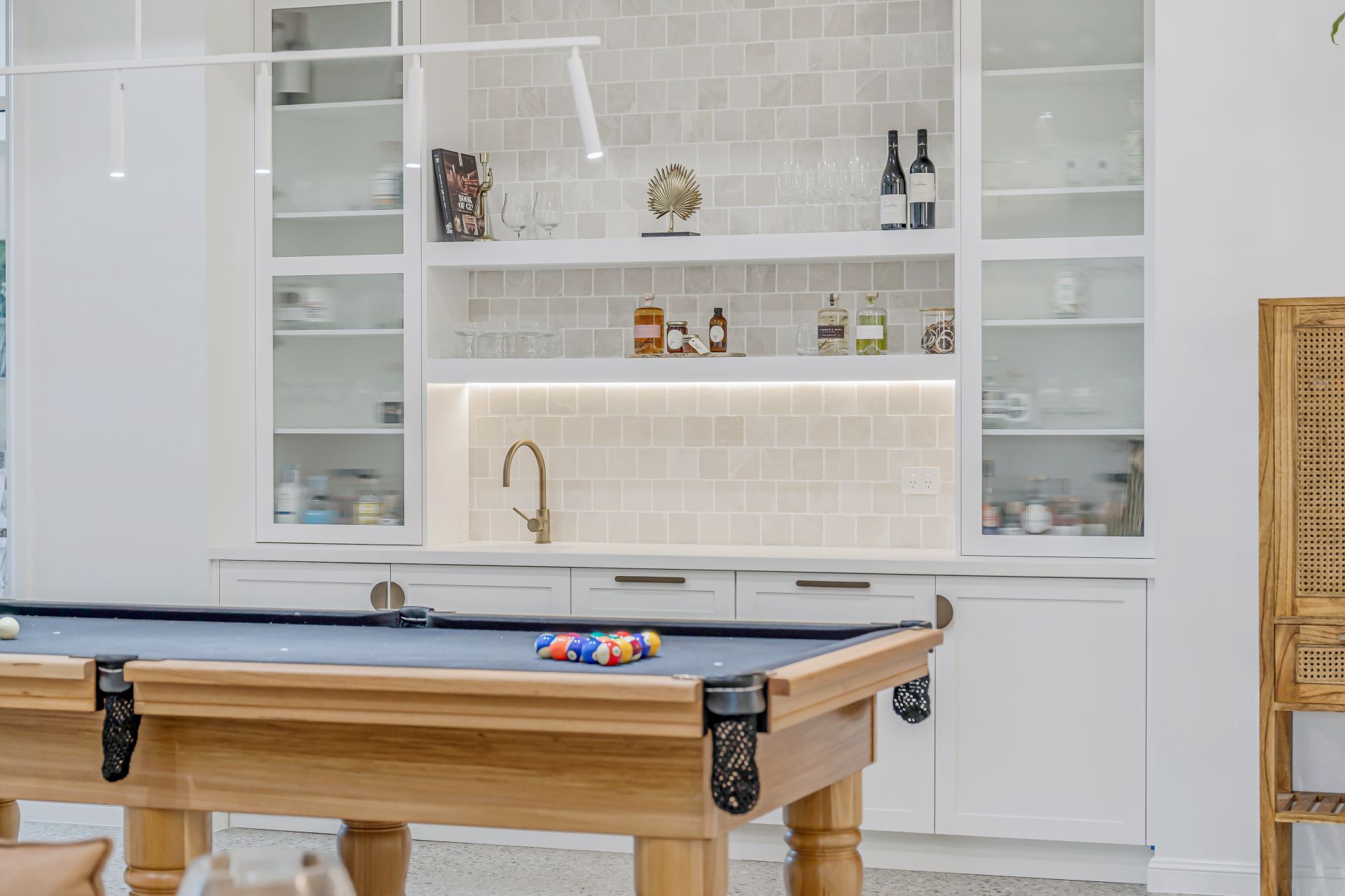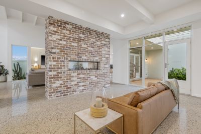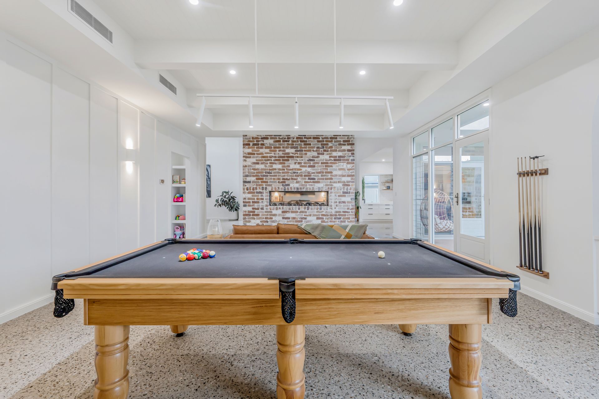 At the heart of the home, the main open plan living is like something out of a vogue interiors magazine. Here a designer kitchen has high-end cabinetry, integrated appliances, a large curved island bench and the ultimate butler's pantry, creating a prefect hub for everyday living. Moving through to the everyday lounge/dining zones where highlight windows and raked ceiling create a wow factor and where you'll love sitting around the striking recycled brick feature wall with an Escea double-sided gas fireplace. On the other side of this stunning feature wall, there is a large media room to escape to watch a movie to and an incredible games room/ entertaining room, with full sized billiard table and built-in bar.