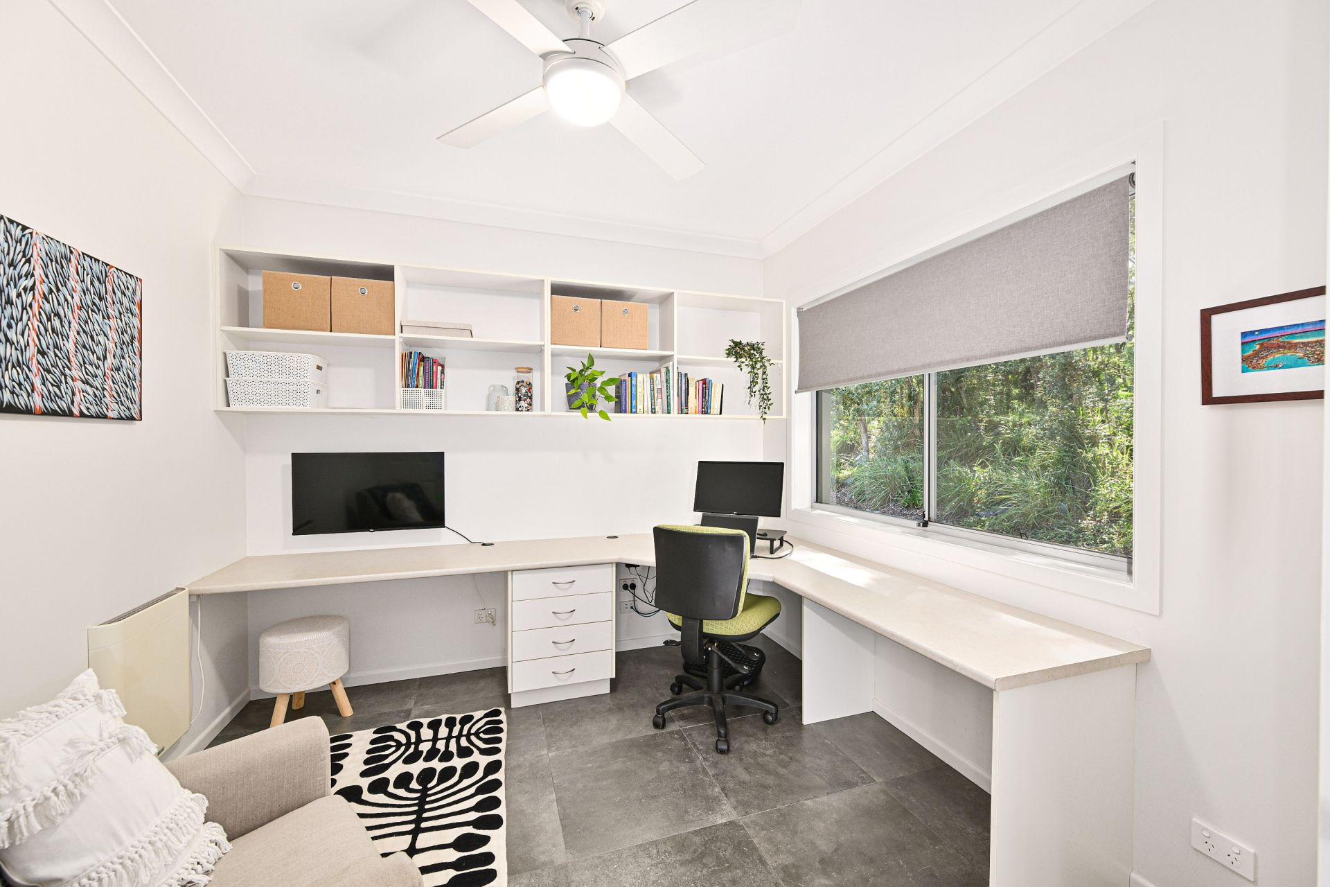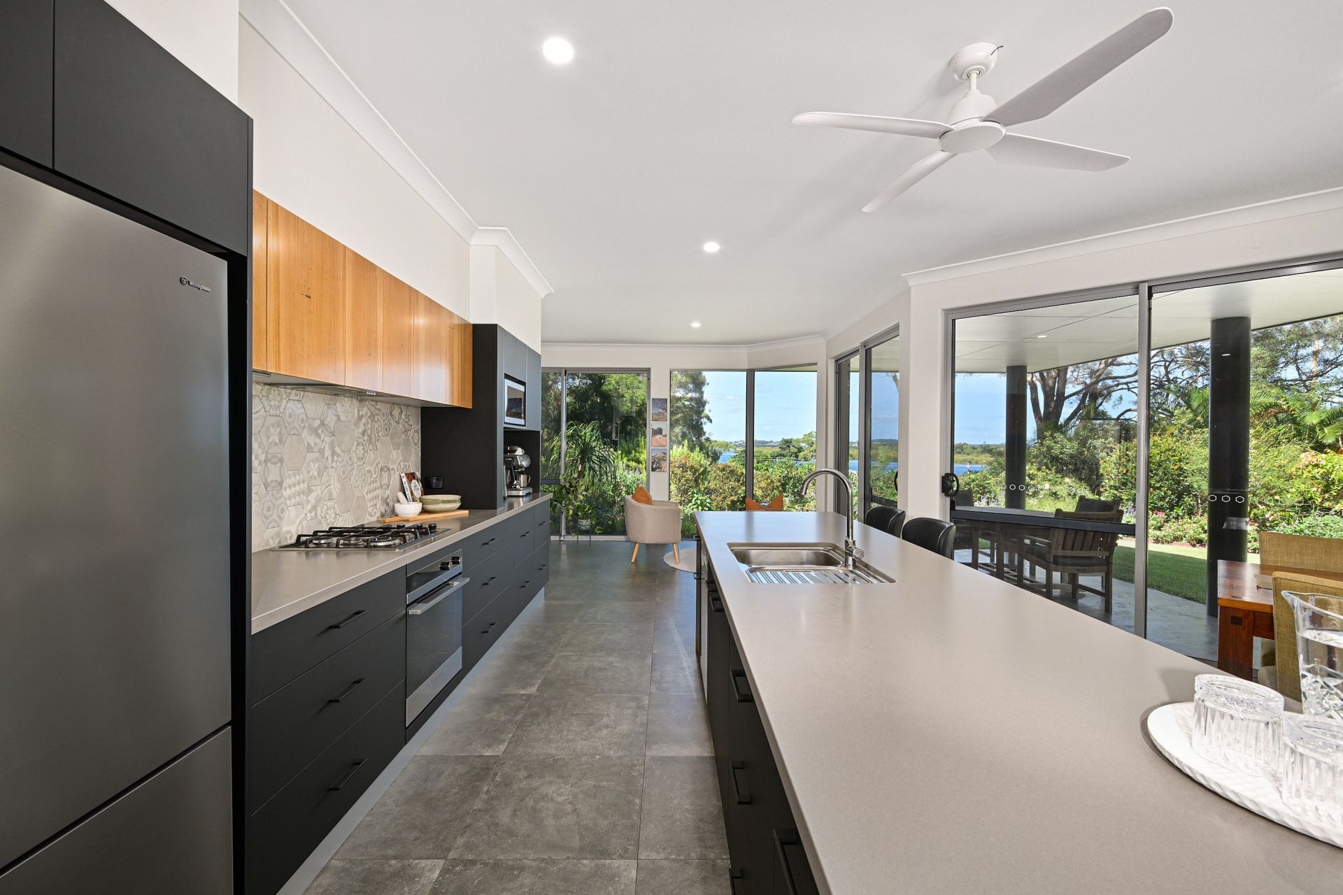 The spacious open living area features numerous living zones, including a casual lounge set near the wood-burner fireplace, a large dining area and a second lounge/ sitting area to the front, where you can take in the best of the water views. A real focal point is the stunning, designer kitchen that features top-end appliances, a gorgeous combination of matt-black and timber cabinetry, and broad stone benches and a very social island, perfect for everyday entertaining. This central living area is complete with air-conditioning and sleek concrete look tiled floors that enhance the feel-good vibe of the home.