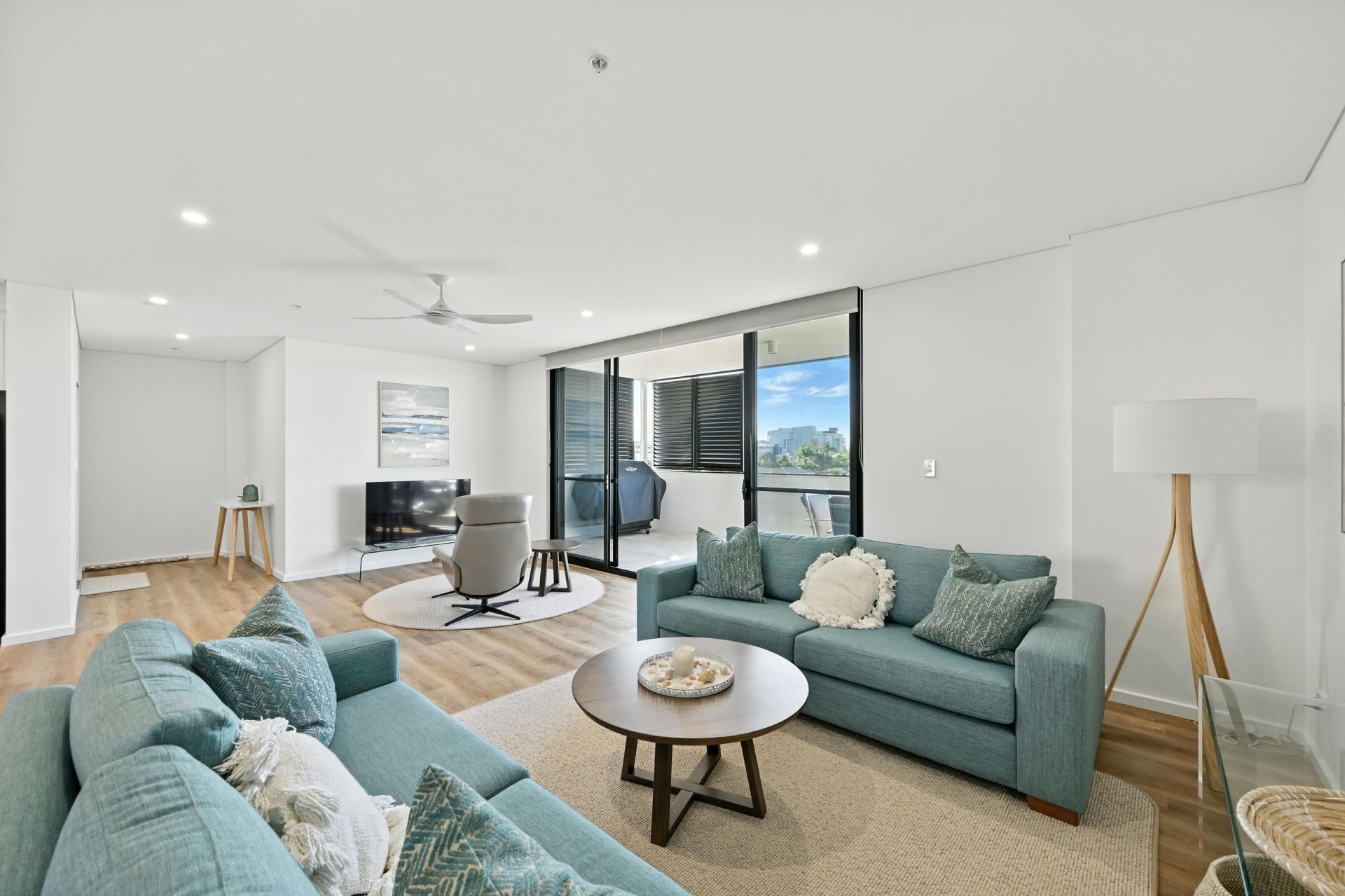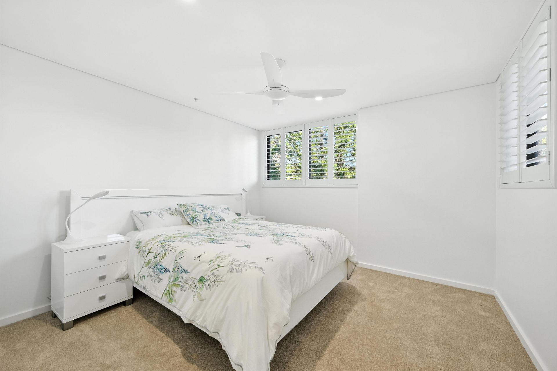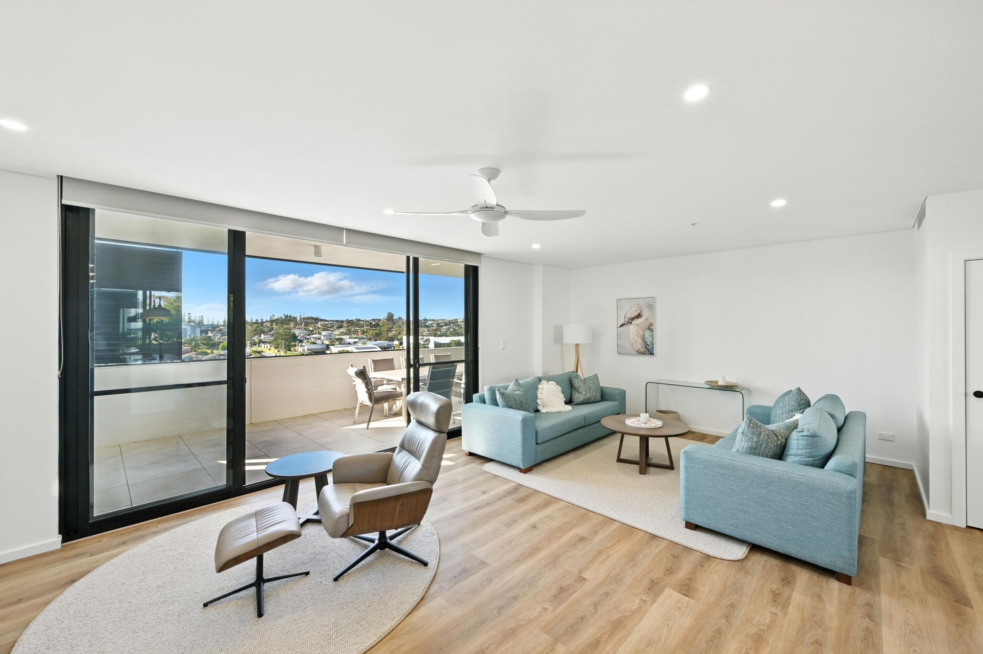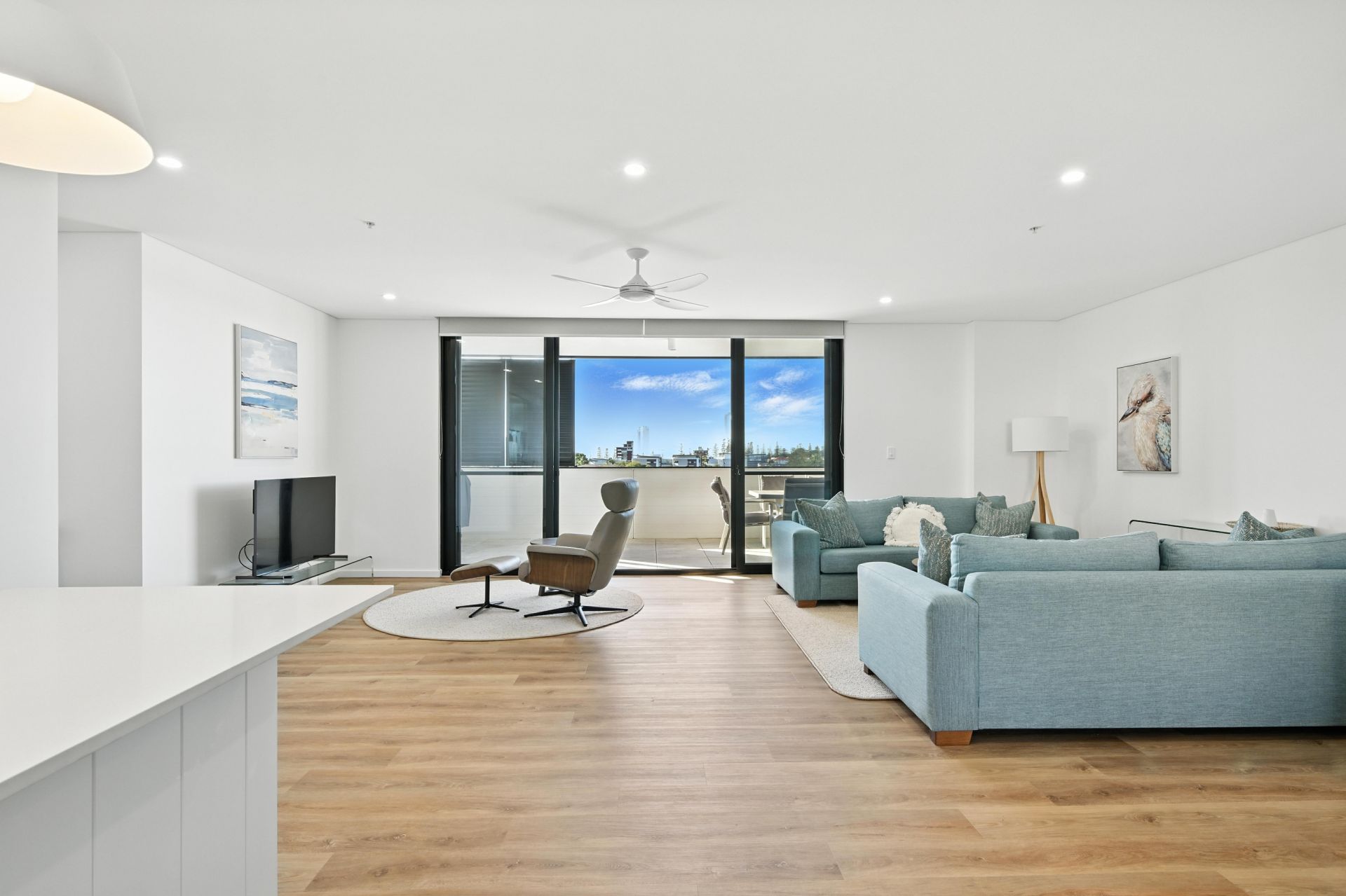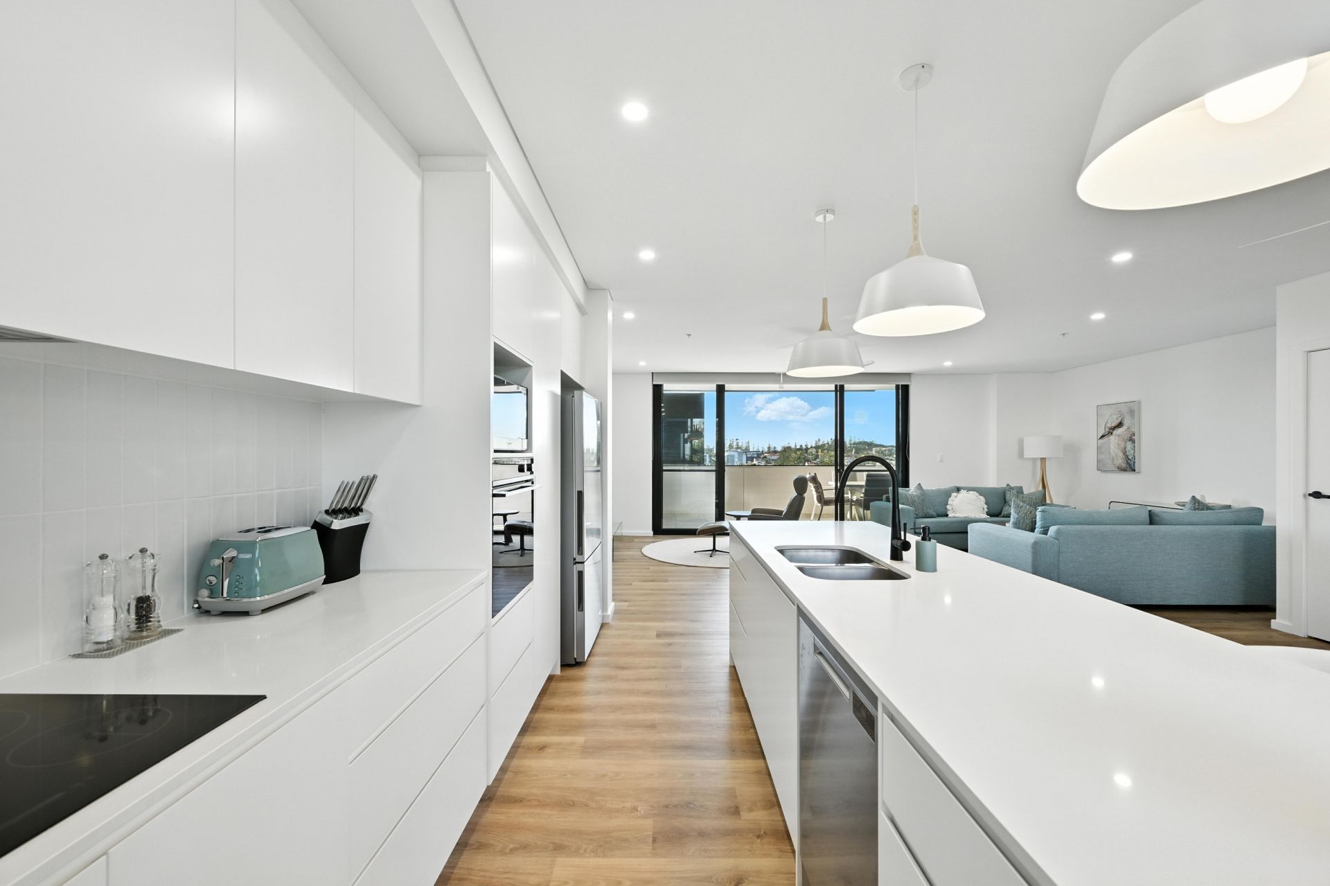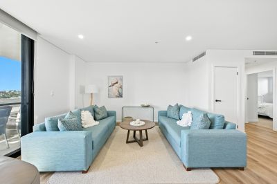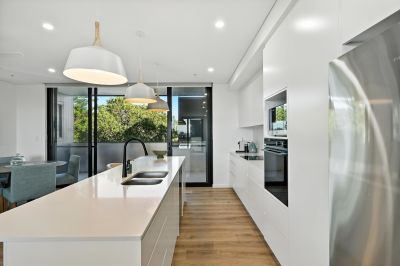 Bathed in natural light, at the heart of the apartment the open-plan layout effortlessly connects the living, dining and kitchen areas, making it perfect for both relaxing and entertaining. A modern kitchen features premium Caesarstone benchtops, a large breakfast bar and ample storage with soft-closing cabinetry. All living areas seamlessly integrate outside to a choice of expansive, balcony areas. To the East, the vast covered balcony provides an incredible space for alfresco entertaining, whilst capturing cool summer breezes, whilst opening out to the western side, another covered verandah looks out to trees and offers a tranquil second space to chill in the open air.