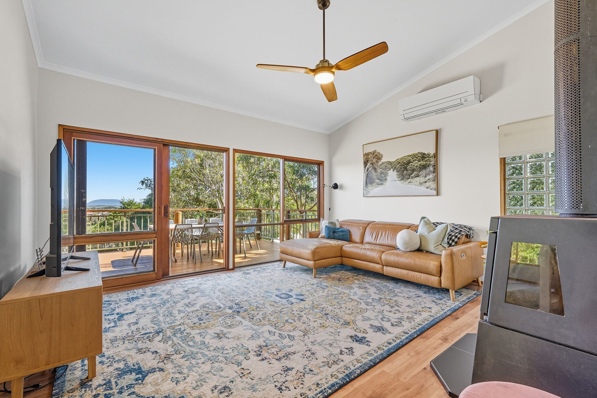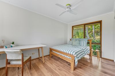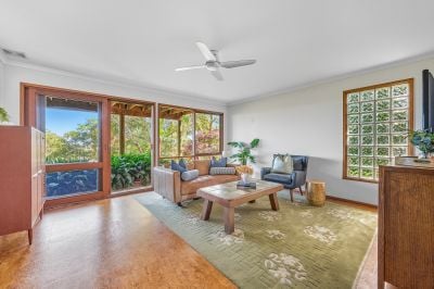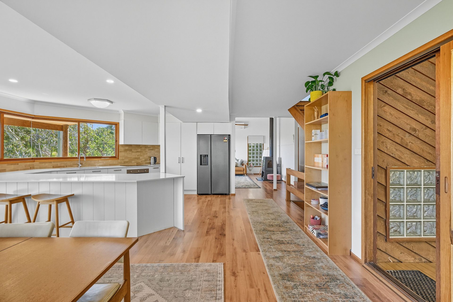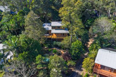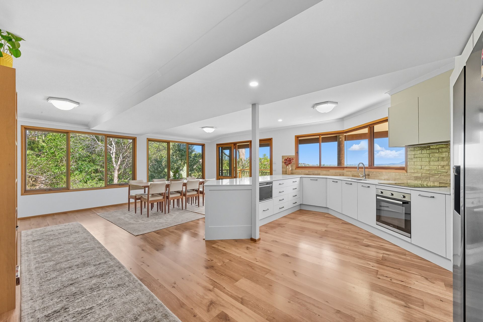 Set amidst rainforest reserve, in a totally secluded and tranquil tree-top environment, this big family home is one-of-a-kind escape. As you step inside, you are immediately impressed by the feeling of space and versatility, the sprawling three-level design presents. On the main level, the open plan area is flooded with sunlight and captures breathtaking views all the way down the coastline from every angle. Here the designer new kitchen is a real showstopper. Featuring broad stone bench tops, high-end appliances and a contemporary design, it opens out to the everyday dining area and is the perfect hub for everyday living. There is also a spacious adjoining lounge area that has soaring high raked ceilings, wood burner fire, air-con and again a cutting edge, stylish design.