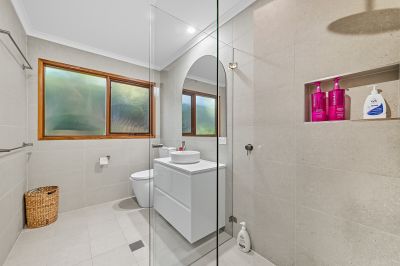 Back inside, there are two queen-sized bedrooms, serviced by a sleek new renovated bathroom with walk-in shower, floor-to-ceiling tiles and custom vanity. Upstairs, the incredible master suite covers the entire top floor, has a large WIR, a luxe new ensuite bathroom and again elevated views, making it the ultimate parent's retreat.