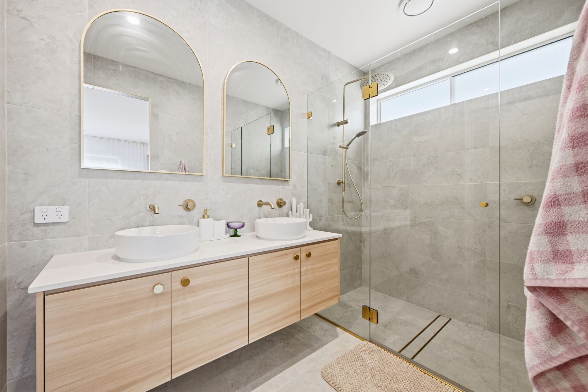 Back inside, the grand, master bedroom suite features its own sumptuous upgrades and offers a sanctuary away from the rest of the home. The vast walk-in wardrobe and a luxurious ensuite with stone-topped double vanity, floor to ceiling tiles and golden arch mirrors it is sure to impress. Three further bedrooms are all king sized, feature built-in-robes and cabinetry and are serviced by another stylish, generously sized, family bathroom with huge walk in shower and freestanding bath.