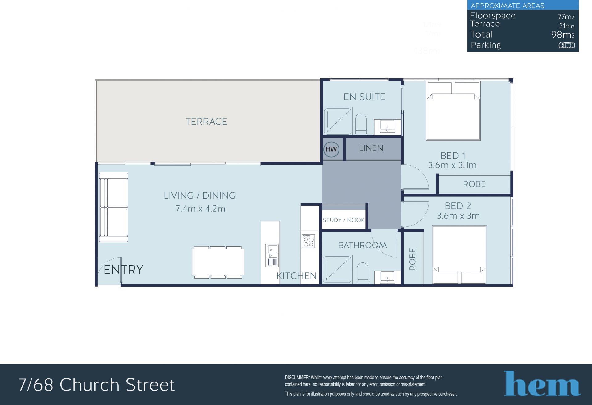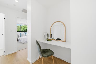 Back inside, the two bedrooms are both a great size, with the main also enjoying a well-appointed ensuite bathroom with walk-in shower and floor-to-ceiling tiles. An equally luxurious main bathroom is positioned next to bedroom two for guests, while there is also a study nook for extra convenience.