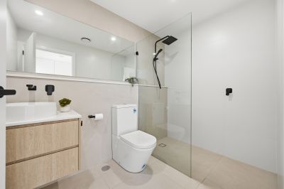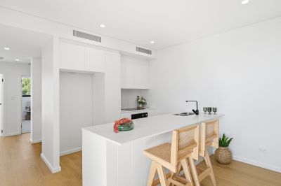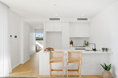 Step inside and you immediately appreciate the light-filled living spaces and stylish interiors that are truly a step above the norm. An open plan kitchen, lounge and dining area features gorgeous, engineered hybrid flooring, high ceilings and huge glazed stacker sliding doors that seamlessly integrates out to a huge undercover balcony. This provides an incredible zone for alfresco entertaining and almost doubles your living space. The kitchen has stone benchtops, white gloss cabinetry and sleek black appliances.